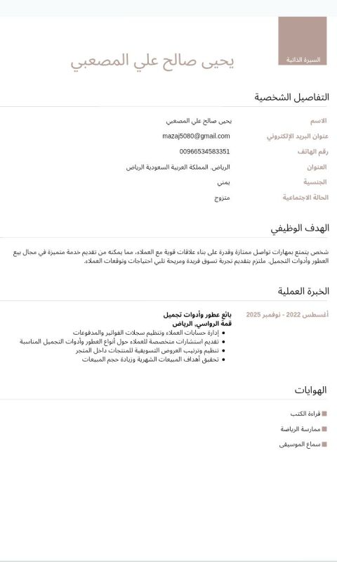 عامل يمني خبرة في مجال العطور وأدوات التجميل 4 سنوات