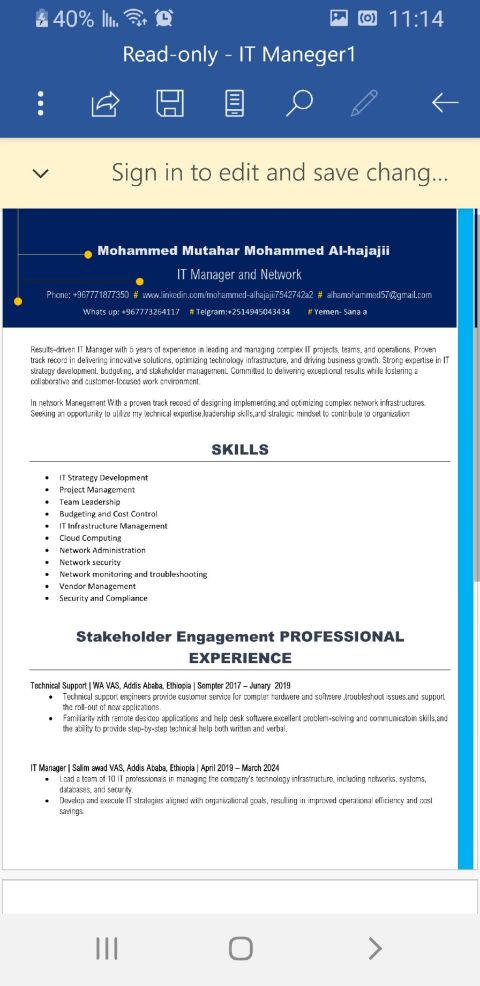 مدير حسابات - رئيس حسابات خبرة 15 سنة مجال المقاولات ومبيعات التجزئة ومصانع الخرسانة الجاهزه الاقرارات الضريبية (VAT) اقرارات الزكاة الالتزام بنظام الفوترة الالكترونية ( E invoicing) اجادة البرامج المحاسبية (مثل SAP - Oracle) فهم قوي للمعايير الدولية (IFRS) خبرة في الضرائب والزكاة في السعودية. مهارات تحليلية وقيادية قوية. اتقان Excel بشكل متقدم. اعداد القوائم المالية قائمة الدخل الميزانية العموم