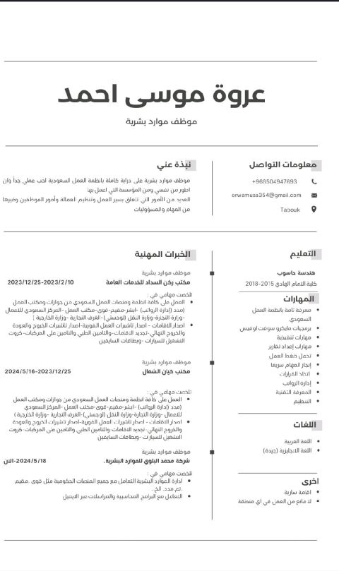 الجنسية سوداني العمر 29 خبرة بادارة الموارد البشرية والتعامل مع جميع المنصات الحكومية مثل قوى مقيم. تم مدد لوجستيك. الخ خبرة باعداد مسيرات الرواتب ومخالصات نهاية الخدمة وتذاكر الطيران ايجاد التعامل مع البرامج المحاسبية والمرسلات عبر الايميل وتنسيق الاجتماعات