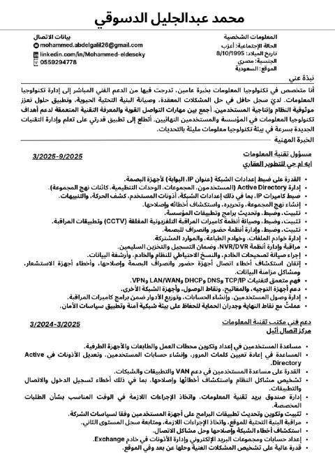 Egyptian Upper Egypt Driver Residency Truck Driver Heavy Transport License Experience in driving all types of cars, trucks and debts Experience in the field of transportation and distribution Familiar with all regions of the Kingdom