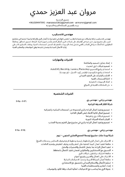 مهندس لاند سكيب وشبكات ري خبرة ست سنوات في ادارة المشاريع وتصميم وتنفيذ شبكات الري للمزارع ومشاريع اللاند سكيب للطرق والحدائق لدي رخصة قيادة وتأشيرة قابلة للنقل متاح للعمل في أي مكان داخل المملكة