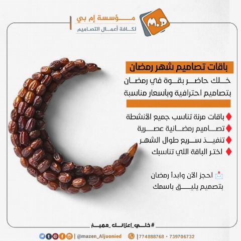 خلك حاضر بقوة في رمضان بتصاميم احترافية وبأسعار مناسبة باقات مرنة تناسب جميع الأنشطة تصاميم رمضانية عصرية تنفيذ سريع طوال الشهر اختر الباقة اللي تناسبك احجز الآن وابدأ رمضان بتصميم يليق باسمك