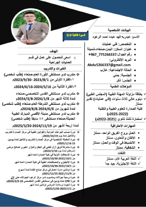 وظيفة ممرض مسجل. عزيزي مدير التوظيف، اتمنى أن تكون بخير. اسمي زبير أحمد أنا ممرض مسجل في SCFHS بالمملكة العربية السعودية. حاليا أعيش في مدينة الرياض. تجربتي في المملكة العربية السعودية 3 سنوات كممرضة. شركة المستشفى والصبر تأخذ الرعاية. أنا عاطل عن العمل هذه المرة لذا أحتاج الى وظيفة، يرجى التحقق من سيرتي الذاتية ومراجعتها معي. شكرا