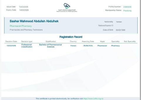 صيدلي، 28 سنة، مرخص من قبل الهيئة السعودية للتخصصات الصحية، امتلك خبرة عملية في صيدليات المجتمع والبحث والتطوير الدوائي، مع مهارات مميزة في تقديم الاستشارات العلاجية، وتحسين تجربة المرضى، وزيادة المبيعات من خلال التوصيات الدقيقة وبناء علاقات ثقة مع العملاء. متمكن في إدارة مهام الصيدلية والعمل تحت الضغط، وأسعى حاليا للحصول على فرصة عمل أقدم من خلالها قيمة مضافة وأسهم في تطوير أداء الصيدلية