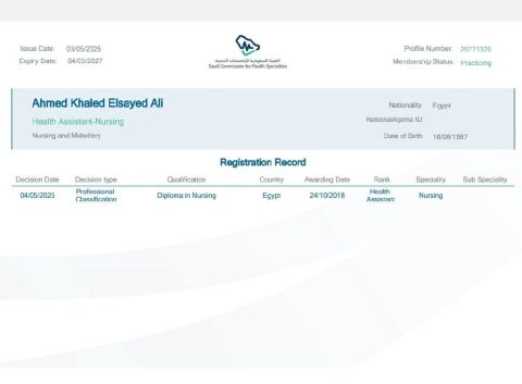 I am Ahmed Khaled, a nursing technician with a valid Prometric license from the Saudi Commission for Health Practitioners. I have two years of experience in the field of central emergency departments. I have six years of experience in the field of intensive care. I have two years of experience in the field of psychiatry and addiction. I have completed ACLS/ BlS training courses. I am looking for job