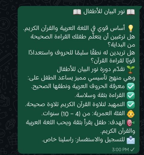 تبي طفلك يتأسس صح ويحب الدراسة يا هلا فيكم. اذا شايل هم تأسيس طفلك أو تبغى أحد يتابعه في دروس الابتدائي بأسلوب ممتع ومبسط، أنا هنا للمساعدة نقدم دروس تقوية وتأسيس في جميع المواد الدراسية تأسيس قوي لغة، رياضيات، وغيرهم. متابعة يومية حل واجبات ومراجعة للاختبارات. شرح مبسط نوصل المعلومة بعيدا عن التعقيد. الموقع خميس مشيط) أو (اونلاين) الأسعار مناسبة جدا