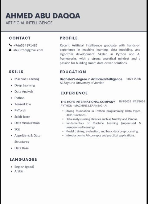 ابحث بشكل فعال عن وظائف في مجالي الذكاء الاصطناعي وتعلم الآلة. امتلك خلفية قوية في علم البيانات وتطوير النماذج والأنظمة الذكية، وأسعى للانضمام الى فرق مبتكرة تعمل على مشاريع ذات اثر حقيقي. تشمل المسميات الوظيفية التي أستهدفها مهندس ذكاء اصطناعي، مهندس تعلم آلة، عالم بيانات، ومتخصص معالجة لغة طبيعية أو رؤية حاسوبية. مقيم في الرياض، المملكة العربية السعودية، ومنفتح على العمل عن بعد أو بنظام هجين