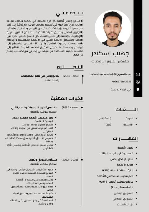 أنا يمني خبير تكنولوجيا معلومات وشبكات (MikroTik & CCN) محاسب ومحلل بيانات محترف، مبرمج بلغة Python ومصمم مواقع ويب وجرافيكس حاصل على بكالوريوس في تكنولوجيا المعلومات والاتصالات، مع خبرة عملية تزيد عن 5 سنوات. خبرة في أمن المعلومات، الدعم الفني، الأنظمة المحاسبية، إدارة البيانات، Active Directory، وتحليل الأداء الشبكي يجيد اللغة العربية بطلاقة والانجليزية جيد، ويتميز بقدرة عالية في العمل الجماعي