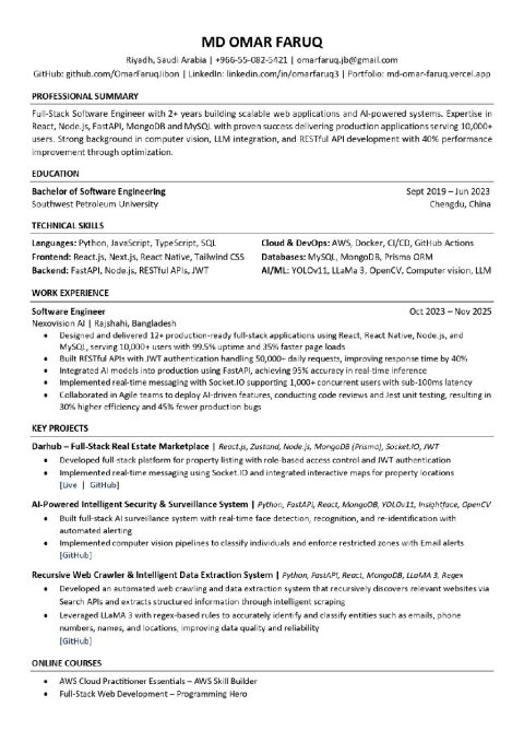 مهندس برمجيات Full Stack بخبرة أكثر من سنتين في React وNode. js وFastAPI وMongoDB وMySQL. طورت تطبيقات تخدم أكثر من 10000 مستخدم. خبرة في REST APIs وJWT ودمج الذكاء الاصطناعي (YOLO وLLaMA وOpenCV) اضافة الى Docker وCI / CD وAWS. مقيم في السعودية وجاهز للانضمام فورا. ابحث عن فرصة كمطور Full Stack أو Backend داخل المملكة