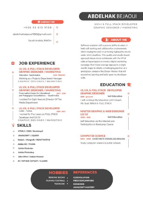خبرة 14 عاما في المملكة. مبرمج، مصمم ومسوق رقمي محترف. متخصص في بناء التطبيقات وإدارة المشاريع التقنية من الألف الى الياء متاح للفرص الوظيفية أو التعاون الاستشاري