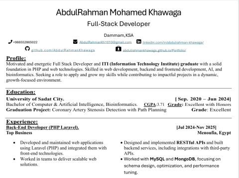 مطور برامج Full Stack لدي خبرة سنة في تطوير البرمجيات، عملت سابقا كمطور Back - End باستخدام PHP وLaravel، وكذلك Programming Instructor. لدي خبرة في العمل على تطبيقات حقيقية بمستوى إنتاجي (Production Level) بالاضافة الى تحليل البيانات والمعلوماتية الحيوية (Bioinformatics) المهارات والخبرات تطوير تطبيقات الويب باستخدام PHP وLaravel. تصميم وتطوير APIs وإدارة قواعد البيانات. بناء أنظمة قابلة للتوسع. مقيم