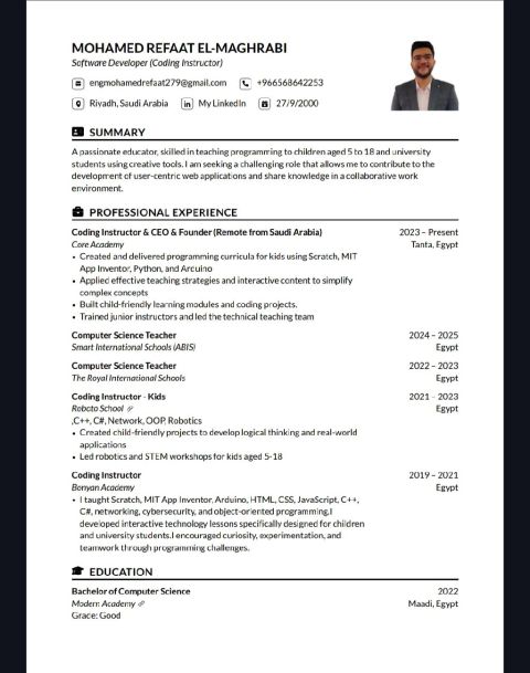 اسمي محمد رفعت، بكالوريوس حاسبات ومعلومات. مدرب برمجة (Coding Instructor) للشباب والاطفال بخبرة في أكاديميات تعليم البرمجة ومدارس دولية. خبرة في تصميم المواقع وIT support واجادة التعامل مع برامج Microsoft 365. مقيم في الرياض بإقامة سارية. ابحث عن فرصة عمل داخل الرياض. من أمامه فرصه وظيفة برجاء التواصل عبر واتساب أو اتصال مباشر، وسأرسل السيرة الذاتية عند الطلب