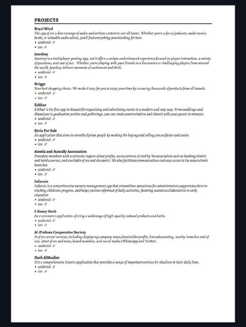 حاليا متواجد في المملكة العربية السعودية وابحث عن فرصة عمل كمطور Flutter. لدي خبرة تزيد عن 5 سنوات في تطوير تطبيقات Android وiOS باستخدام Flutter، مع خبرة في Clean Architecture وربط APIs وإدارة الحالة. عملت على مشاريع في السوق السعودي والخليجي لأكثر من 3 سنوات، وطورت أكثر من 15 تطبيقا منشورا على Google Play وApp Store وحققت آلاف التحميلات. يسعدني مشاركة السيرة الذاتية وروابط التطبيقات