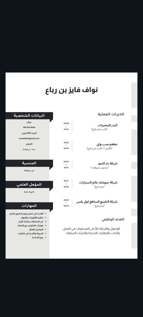 نبذة عن خبراتي اشتغلت أمين مخازن ومستودعات مدة 4 سنة الاهتمام والترتيب واستقبال واخراج البضائع مع التحويلات الخاصة بالطلب ومتابعة المخزون وكذلك مشرف صالة ومن ثم مشرف فرع وكذلك عندي خبرات في الكاشير نشيط وسريع جدا لبق في الكلام ولدي شخصية اقناع والتعامل مع العميل لدي خبرة كافية في استخدام الحاسب الآلي واشتغلت في الاستعلامات وخدمة عملاء ومندوب مبيعات عطور ومواد غذائية ومكسرات ومحامص