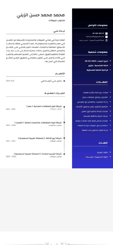 أنا اسمي محمد العمر 30 سنة، ابحث عن وظيفة مندوب مبيعات لسبب وجود خبرة في مجال المبيعات ويوجد لدى رخصة نقل ثقيل سارية وإقامة سارية والتواصل على الرقم
