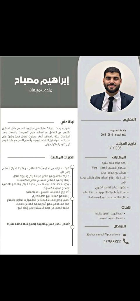 مندوب مبيعات ومصمم مطابخ خبرة 5 سنوات في كبرى شركات المملكة
