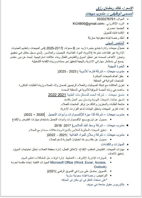 ابحث عن فرصة عمل مناسبة في مجال المبيعات أو خدمة العملاء اسمي السيد عبد الفتاح أحمد امتلك خبرة مميزة تمتد لأكثر من سنتين في مجال المبيعات وخدمة العملاء في قطاعات متنوعة مثل الدهانات، التجزئة، المقاولات عملت سابقا كمثال مسؤول مبيعات - مدير مبيعات - مشرف صالة عرض وحققت خلالها نتائج ممتازة في إدارة فرق العمل وتنمية المبيعات وتحسين رضا العملاء جاهز للنقل والتنقل في أي مكان في المملكة