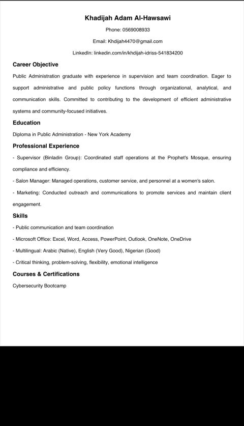 أنا شابة طموحة للعمل والتطور في مجال الأعمال اتمنى من حضرتكم إتاحة الفرصة خبرتي العمل والاشراف في شركة بن لادن بالمسجد النبوي وادارة صالون أملك المهارات الناعمة وبرامج المايكروسوفت المرونة للتعلم أكثر من شاغر مما ساعدني لدراسة 7 دبلومات بتخصصات مختلفة وهي (الإدارة العامة، الموارد البشرية، إدارة الأعمال علم النفس الحاسب الآلي، السكرتارية التنفيذية وادارة المكاتب المحاسبة المالية)