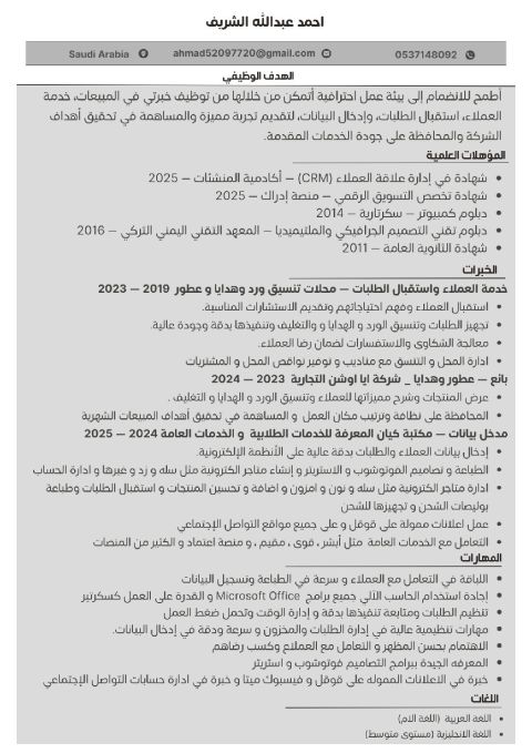 امتلك خبرة قوية في خدمة العملاء والمبيعات وإدارة الطلبات، مع قدرة عالية على استقبال العملاء ومعالجة الشكاوى بدقة. متمكن من العمل على المتاجر الالكترونية مثل سلة وزد ونون، من اضافة وتحسين المنتجات واستقبال الطلبات وتنظيمها. أجيد ادخال البيانات بسرعة، والخدمات الالكترونية، وMicrosoft Office، وإدارة حسابات التواصل الاجتماعي. أتمتع بالباقة وقدرة على التنظيم والعمل تحت الضغط وتحقيق أهداف العمل