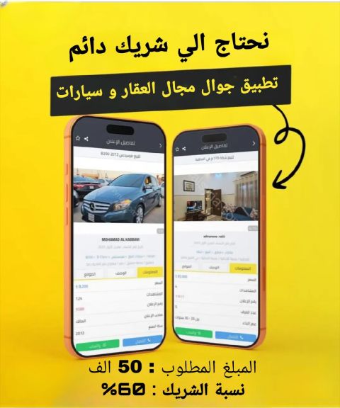 لدينا فكرة تطبيق جوال تم انتهاء من التصميم وجاهز الى مرحلة البرمجة فكرة التطبيق مجال العقار وسيارات ولكن بشكل جديد ومطور ونحتاج الى شريك المبلغ المطلوب 50 ألف ونسبة الشريك 60% باقي التفاصيل عند التواصل مكتبنا في الرياض نحن فريق مكون من ثلاث أشخاص تشغيل إدارة وتطوير