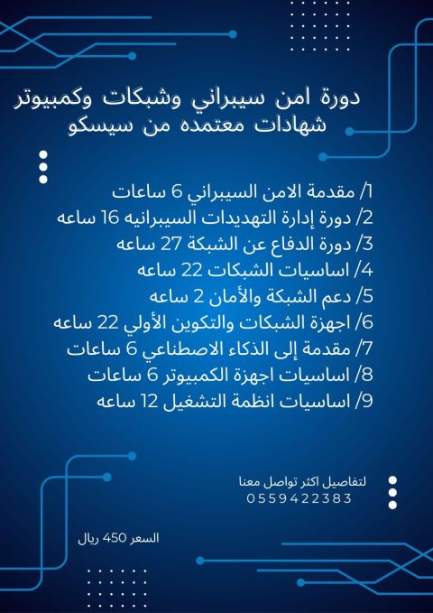شهادة أمن سيبراني وشبكات وكمبيوتر 9 شهادات معتمده من سيسكو 1 / مقدمة الأمن السيبراني 6 ساعات 2 / دورة إدارة التهديدات السيبرانيه 16 ساعة 3 / دورة الدفاع عن الشبكة 27 ساعة 4 / أساسيات الشبكات 22 ساعة 5 / دعم الشبكة والأمان 2 ساعة 6 / اجهزة الشبكات والتكوين الأولى 22 ساعة 7 / مقدمة الى الذكاء الاصطناعي 6 ساعات 8 / أساسيات اجهزة الكمبيوتر 6 ساعات 9 / أساسيات أنظمة التشغيل 12 ساعة السعر 450 ريال لتفاصيل أكثر تواصل