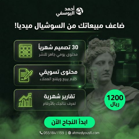 ضاعف مبيعاتك من السوشيال ميديا 30 تصميم احترافي شهريا + محتوى تسويقي جاهز للنشر 1200 ريال مناسب للمتاجر والأعمال في السعودية. ahmedyousfi. com