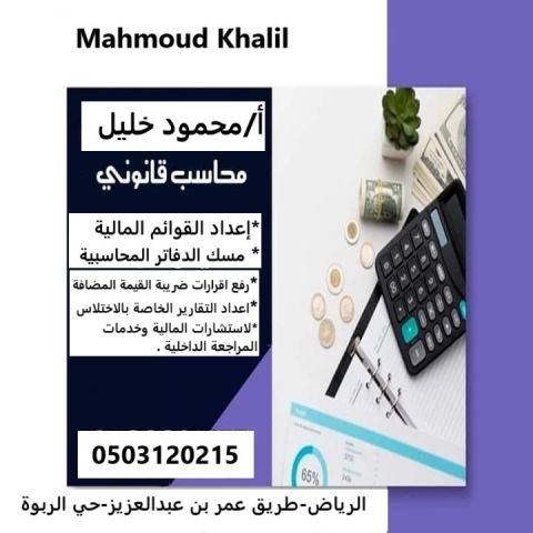 محاسب مصري خبرة أكثر من 12 عاما بالمملكة يجيد خدمات الزكاة والضريبة المضافة من اعداد ومتابعة كشوف المبيعات والمشتريات ورفع اقرارات ضريبة القيمة المضافة الربع سنوية واقرارات الزكاة السنوية بأتعاب مخفضة جدا