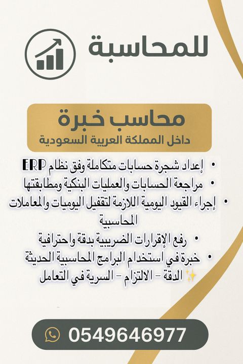 تدور على محاسب شاطر ومكاتب مراجعة معتمدة وفر وقتك وخليك مطمن مع خدماتنا المحاسبية المتكاملة اللي نقدمها لك إدارة وحل كل شؤونك الضريبية والزكوية بكل احترافية. تجهيز القوائم المالية لشركتك حسب المعايير الرسمية. تنظيم الحسابات ومسك الدفاتر بشكل مرتب وواضح. مراجعة داخلية لضمان الشفافية. استشارات مالية وادارية تساعدك تأخذ القرار الصح. معنا تضمن السرية + الالتزام + الجودة. رقم التواصل