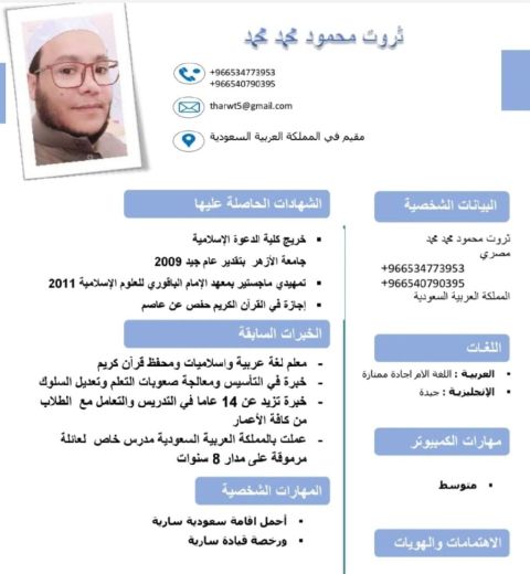 الاسم/ علاء جلال عبد الموجود محمد العنوان الشنان في حائل السعودية موبايل 0537680919 الجنسية مصري الديانة مسلم تاريخ الميلاد 16101967 البريد الألكتروني المؤهل ليسانس أداب التخصص لغة انجليزيه العمل السابق مدرس مرحلة متوسطة مدة 10 أعوام 2 مدرس ثانوي 16 تجارة سيارات 20 المؤهلات الشخصية يمكنني العمل القيادي في أي مجال أجيد فن التدريس لدى خبرة بالحسابات لدى خبرة بالتجارة أجيد التحاور