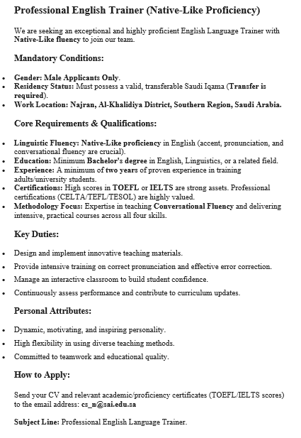 Professional English Trainer (Native - Like Proficiency) We are seeking an exceptional and highly proficient English Language Trainer with Native - Like fluency to join our team. Mandatory Conditions Gender Male Applicants Only. Residency Status Must possess a valid, transferable Saudi Iqama (Transfer is required) Work Location Najran, Al Khalidiyah District, Southern Region, Saudi Arabia. Core