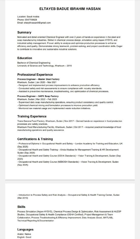 مهندس كيميائي مشرف انتاج مهندس سلامه