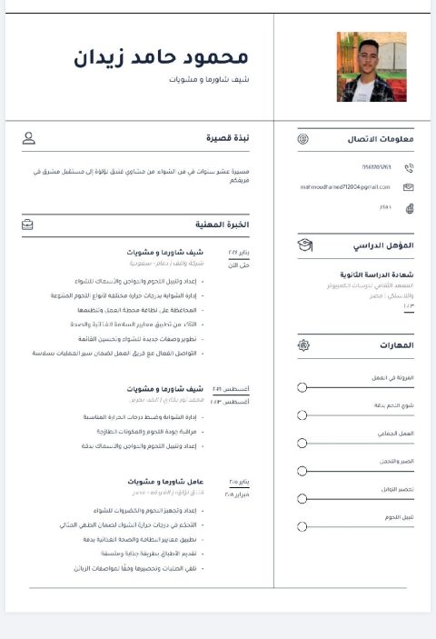 طاه محترف بخبرة واسعة في المطاعم والفنادق، عملت في عدة مطاعم واوتيلات مرموقة وساهمت في افتتاح مطعمين من التأسيس حتى التشغيل. متخصص في الأطباق العربية والغربية، وتجهيز البوفيهات وخدمات الكيترنق. متمكن من إدارة المطبخ وضبط التكاليف (Food Cost) تقليل الهدر، إدارة المخزون، وتطبيق معايير النظافة وسلامة الغذاء (HACCP) مع قيادة فريق العمل بكفاءة