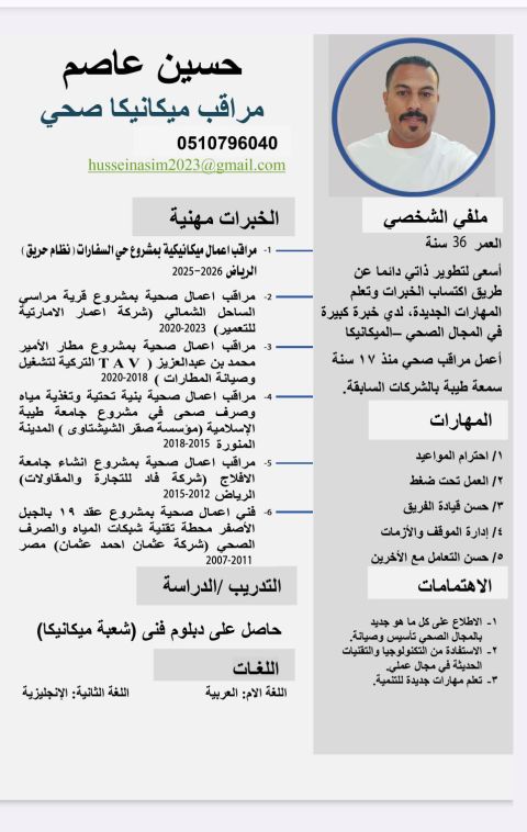 مشرف سباكه ميكانيكا إقامة مهنية رخصة قيادة