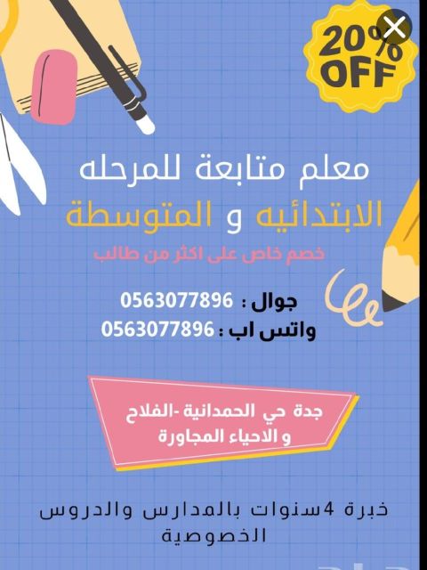 معلم متابعة للمرحلة الابتدائية تأسيس وتم هيد لصفوف الأولى ومعلم متابعة للصفوف العليا خبرة 5 سنوات نسعى جاهدين لجعل العملية التعليمية ممتعا للتواصل