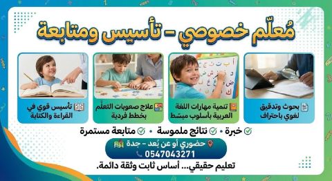 Private teacher - Education That Makes a Difference Strong foundation in reading and writing Learning difficulties treatment through individualized plans Developing Arabic language skills in a simplified, effective way Professional research and linguistic proofreading Experience - Tangible results - Continuous follow - up In - person or online - Jeddah