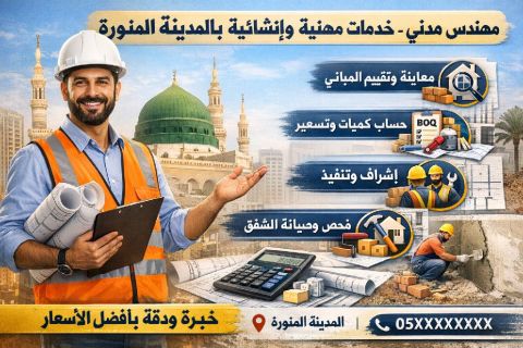 Sudanese Civil Engineer with experience in Madinah. Providing building and apartment inspection and evaluation, maintenance and renovation assessment, material quantity takeoff and cost estimation, structural works compliance with drawings, BOQ preparation, and supply of construction labor for specific tasks with full supervision. Accuracy, experience, and realistic pricing
