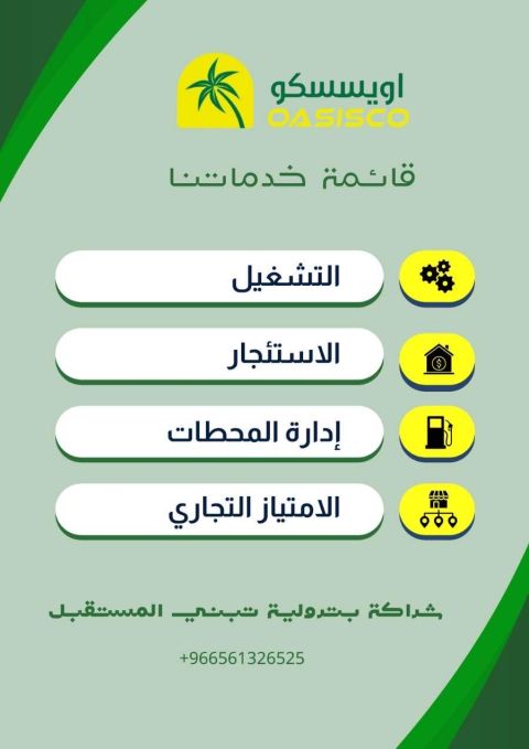 فرصه ذهبيه مطلوب شريك ممول لمشروع محطات وقود والمشروع مربح جدا بإذن الله تعالى الى كل من يحب يشتغل فرصه نكون يد واحد الى النجاح شركة. مسجله بعلامة تجاريه. اويسسكو. للخدمات البتروليه تشغيل محطات الوقود استئجار - تشغيل - تطوير. ادارة المحطات مطلوب شريك أو شريكة. سوا سعودي أو أجنبي. رجل أو أمراه. حقوق الشريك الممول 1 - الدخول في عقد التأسيس لشركة 2 - الدخول فالسجل التجاري ويكون شريك