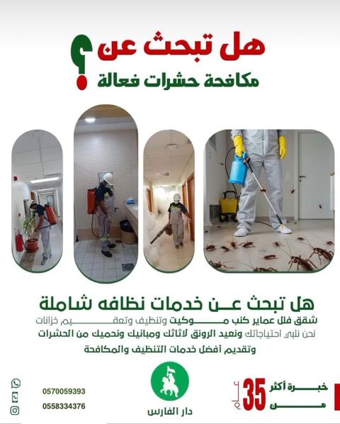 مؤسسة دار الفارس لمكافحة الحشرات ونظافة عامة ونظافة وغسيل كنب بالبخار والتحصين ضد النمل الأبيض مع الضمان خبرة أكثر من 30 عام