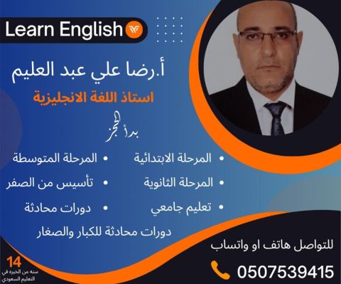 معلم لغة انجليزية مؤهل، أقدم دروس اللغة الانجليزية لجميع المستويات. متاح للتدريس اونلاين أو حضور الطالب، أو الذهاب اليه حسب ما يراه مناسبا. أحرص على أسلوب تدريسي مبسط وفعال لتحقيق أفضل النتائج