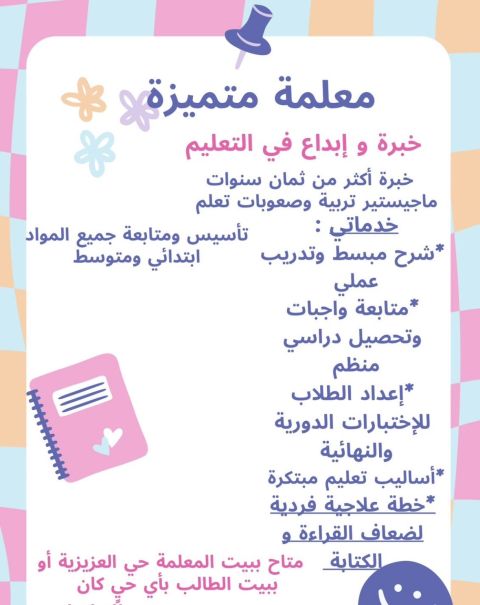 معلمة تأسيس ومتابعة جميع المواد ابتدائي ومتوسط خبرة أكثر من 4 سنوات بالتدريس للمرحلة الابتدائية والمتوسط خبرة بالمناهج السعودية متابعة واجبات وتحصيل دراسي منظم اعداد الطلاب للاختبارات الدورية والنهائية أساليب تعلم مبتكرة متاح بيت المعلمة بحي العزيزية أو بيت الطالب بأي حي كان للتواصل واتساب على الرقم والاتصال فقط على الرقم
