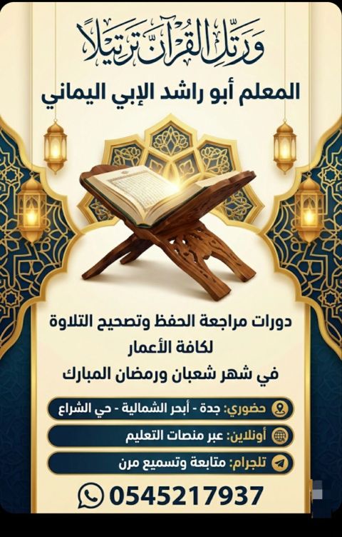 معلم قرآن وتجويد وقراءات موجود بالخبر والدمام سواء حضوري أو اونلاين خبرة أكثر من ثلاث سنوات في السعودية معي اجازات بالقراءات العشر الصغرى تعليم وتحفيظ القرآن والتجويد. النظري والعملي وتأسيس الاطفال من الروضة في اللغة العربية والأملاء والكتابة وتحسين الخط