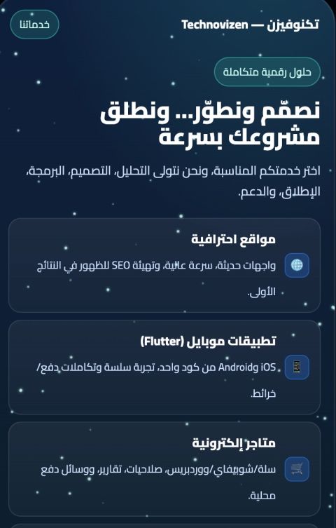 في زمن السرعة، عملاؤك يبحثون عنك على هواتفهم وشاشاتهم. نحن في تكنوفيزن نبني لك حضورا رقميا احترافيا مواقع عصرية متوافقة مع جميع الاجهزة ومحسنة للظهور في محركات البحث. تطبيقات جوال سلسة وسريعة تحاكي توقعات عملائك. حلول تقنية موثوقة تزيد ثقة العملاء وتختصر وقتك. معنا يتحول احتياجك الى مشروع ناجح يترك انطباعا قويا من أول نقرة