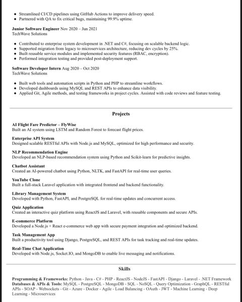 I am a Software Engineer specialized in Full Stack and AI driven applications, with hands on experience in Laravel, Flutter, FastAPI, Node. js, Django, and React. I build scalable, high performance, and reliable systems from backend architecture to intelligent automation. I am currently seeking new opportunities where I can contribute to impactful projects and help teams innovate faster