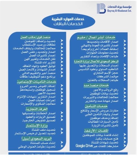 مؤسسة بيرق الخدمات شريكك الموثوق للنجاح، نقدم لكم خدمات مبتكرة في إدارة الموارد البشرية والمنصات الحكومية والدعم الاداري للشركات الصغيرة والمتوسطة وبأسعار جدا تنافسيه تتناسب مع حجم أعمالك