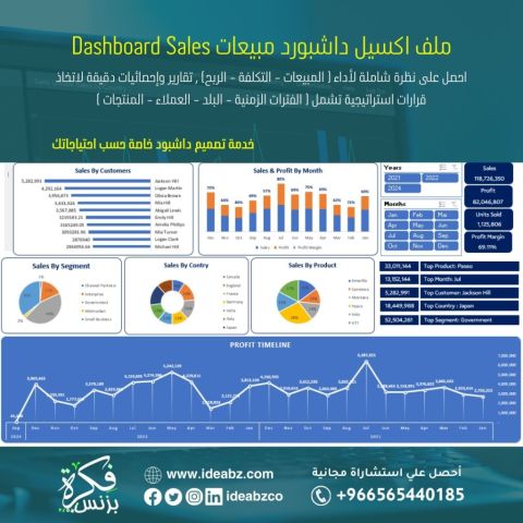 احصل على نظرة شاملة لأداء مبيعاتك مع "Dashboard Sales" الاحترافي تحليل شامل ودقيق لمبيعاتك، يشمل الكميات المبيعات التكلفة الربح يمكنك الآن تحليل أداء مبيعاتك بسهولة على مستوى الفترات الزمنية (السنوات، الشهور، الأيام) البلد العملاء تصنيف المنتجات نفسها استفد من تقارير وإحصائيات دقيقة
