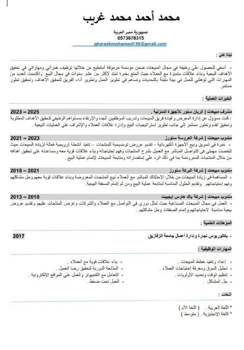 أنا محمود من مصر 32 عام ابحث عن عمل أنا جديد داخل المملكة، اشتغلت مندوب مبيعات لشركة مواد غذائية وشركة Glc للدهانات، وأيضا مدخل بيانات ومحاسب لشركة اغا للسياحة، واشتغلت خدمة عملاء لشركة فودافون، وأيضا اشتغلت مبيعات داخل فروع اتصالات مصر، وأخيرا كنت شغال في شركة المصرية للاتصالات وي اشتغلت فيها من ايجنت مبيعات حتى وصلت لآخر بوزيشان كنت مدير مبيعات، ومعي إقامة سارية، ورخصة قيادة