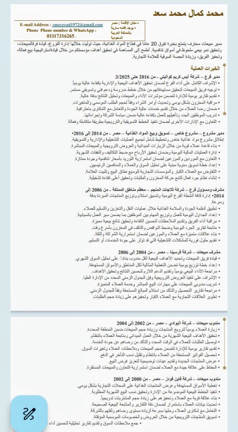 مدير مبيعات خبرة أكثر من 15 عام بداية مع شركة المنجم قرابة 8 سنوات من 2006 الى 2014 كوالتي ايس كريم قرابة 9 سنوات من 2016 الى 2025 سنوات) أتمكن من تدريب الفرق على مهارات التواصل الفعال وضع الخطط لتحقيق الأهداف والابتكار المستمر ومتابعة المنافسين لضمان بقائنا في المقدمة وأسعى دائما لتحقيق نتائج متميزة تنعكس على النمو. لدي اقامة سارية ومتاح نقل كفالة ويوجد ورخصة سارية