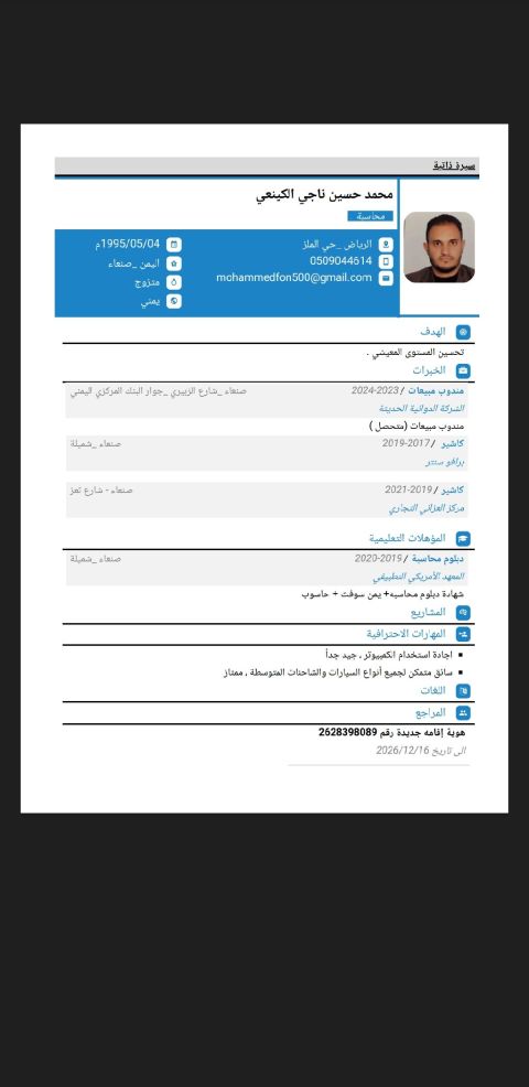 محمد الكينعي يمني الجنسية العمر 30 سنة إقامة سارية للعمل في سوبرات أو مراكز تجارية أو مطاعم أو محلات تجارية مع وجود خبرة في العمل كاشير أو أي عمل