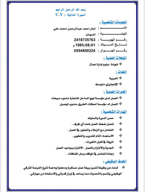 أنا شاب سوداني ابحث عن عمل وأحمل رخصة قيادة سارية وإقامة سارية ولدي الخبرة لدي مندوب مبيعات أو مندوب مشتريات ولدي الخبرة في الحاسب الآلي واشراف على محلات أو عمال أو مندوب ميداني ولدي خبرة أمين مستودع ولدي خبرة في مجال الشقق الفندقية المخدومة ولدي خبرة في مجال قطع غيار السيارات مشرف مستودع أو مبيعات خبرة الترحيل والنقل وإدارة التشقيل وأتحمل ضغط العمل والتعاون مع فريق العمل وشعاري الصدق والامانة