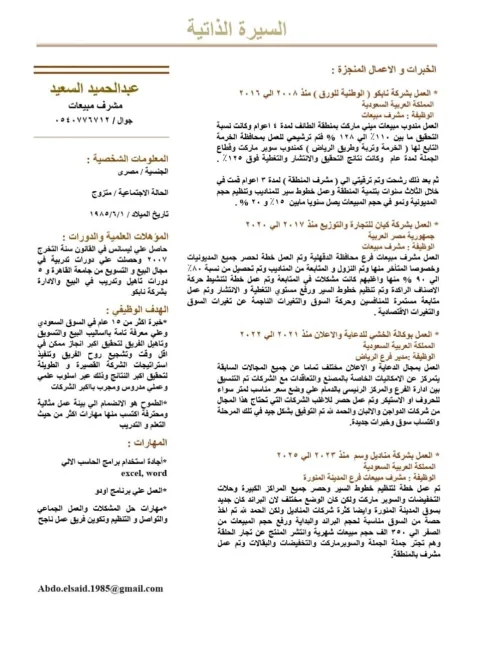 خبرة في السوق السعودي لأكثر من ثلاث سنوات خبراتي في إدارة التسويق والمبيعات وعندي خبرة واسعة بالتعامل مع العملاء وتنظيم المهام وتحقيق الأهداف وتطوير المكان وأنا على رأس العمل ولكنني ابحث عن الأفضل وفي أي بيئة تطمح للتطور والنجاح